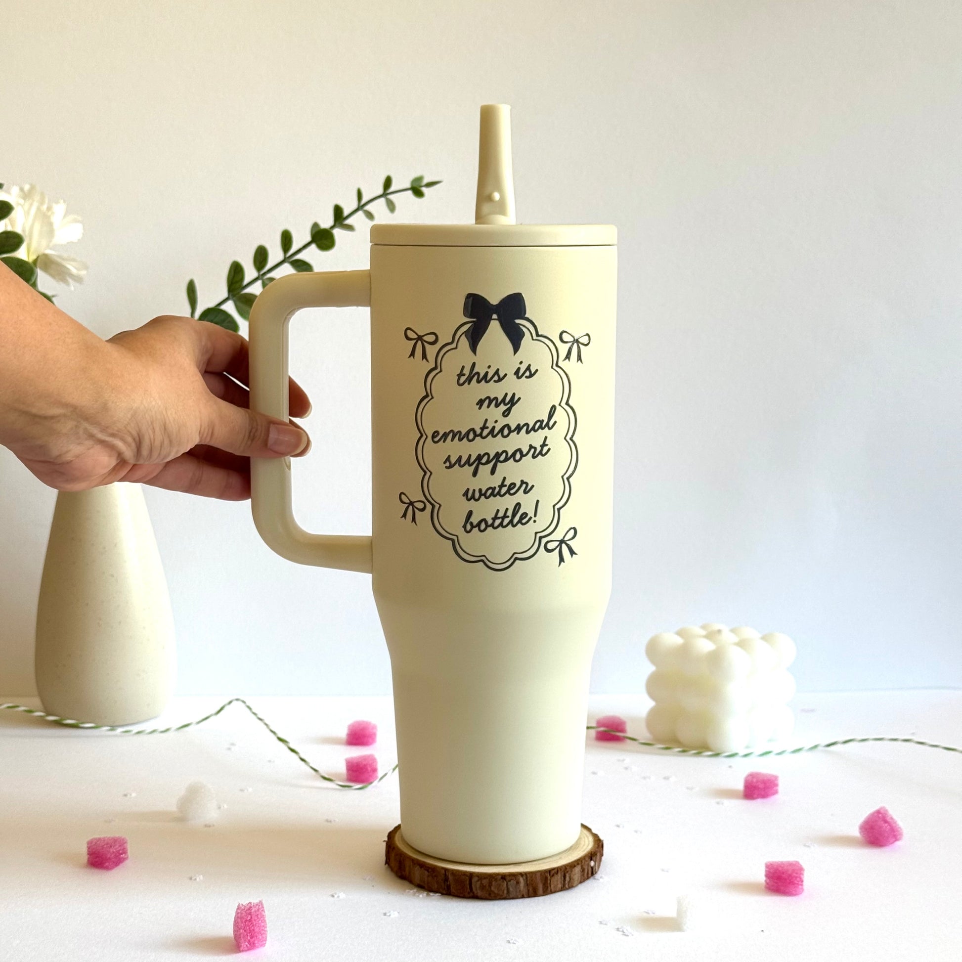 • The Humorous: "this is my emotional support water bottle!" - A fun, relatable quote for your hydration buddy. (Shown in Cream)