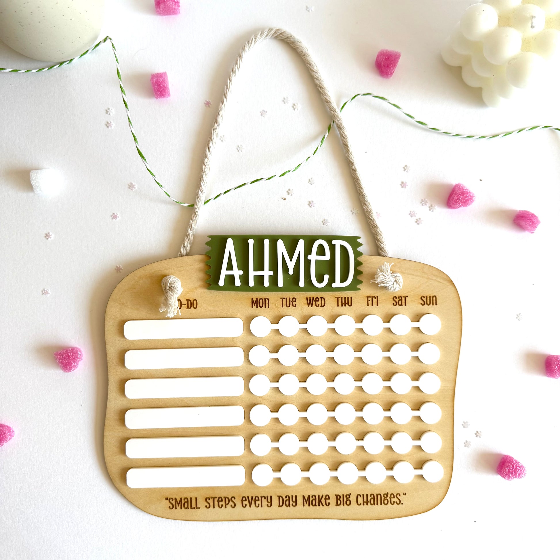 • Includes: Wooden weekly tracker, daily check-off markers, and hanging rope.